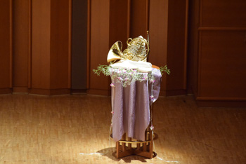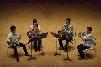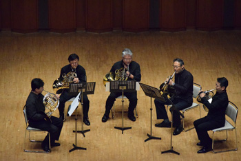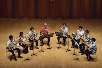 2団体目の「ホルン友の会」は前述のように、首都圏を中心とした音大生、卒業生の学校を越えた交流のために伊藤氏が提唱して作られたもの。この日も武蔵野音大、東京藝大、昭和音大、洗足学園と普段は別々の学校で学んでいる大学生による演奏で外山雄三《6本のホルンのための"パッサ・テンポ"》。この曲は故・千葉馨氏の依頼で作曲され、伊藤氏も所属していた東京ホルンクラブにより初演された。タイトルは「過ぎ去った時間」というような意味を持ち、曲調もどこか旧き良き時代を感じさせるもの。音大生による演奏はとても真面目で、丁寧な仕上げが好ましいが、ここに“音楽の生命力”のようなものが加わると、この日聴くことができた諸先輩方の演奏により近づけるように思えた。 |